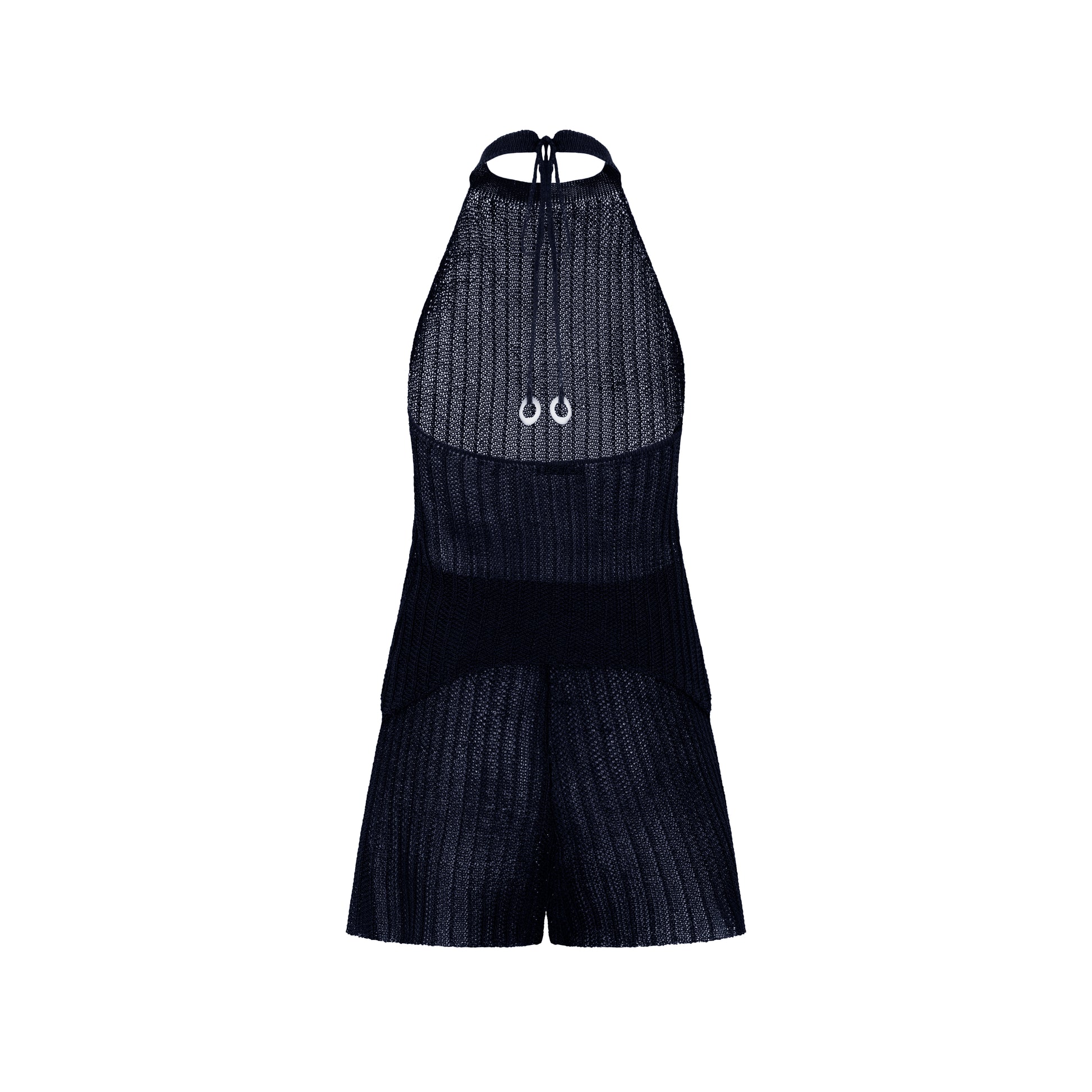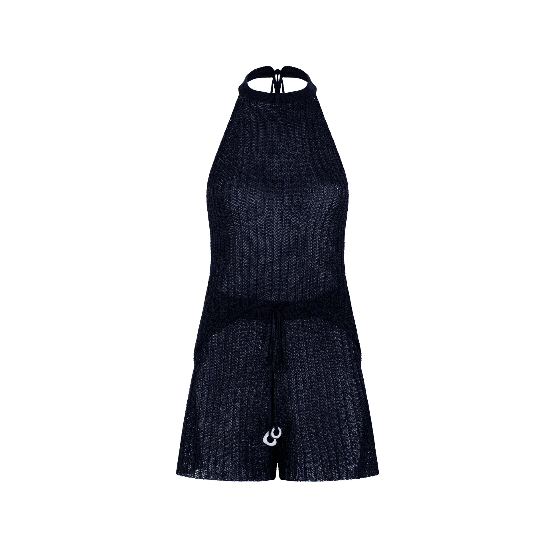 Set halter en tejido de punto confeccionado con hilos de seda de la más alta calidad. Su diseño exclusivo incluye delicados detalles de accesorios en madera, cuidadosamente trabajados a mano por artesanas expertas. Cada pieza se realiza en cantidades limitadas.